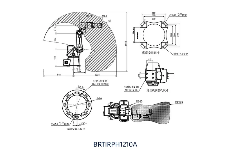 BRTIRPH1210A是博朗特针对焊接、去毛刺、打磨应用行业研发的一款六轴机器人。其外形紧凑,体积小,重量轻,最大负载10kg,臂展1225mm。其手腕采用中空结构,布线更便捷,运动更灵活。第一、二、三关节均采用高精度减速机,第四、五、六关节均采用高精度齿轮结构,高速的关节转速使操作更加灵活。防护等级达到IP54,防尘防水,重复定位精度±0.07mm。