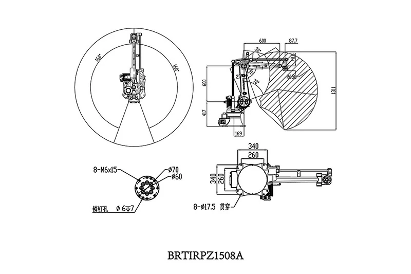 BRTIRPZ1508A型机器人是博朗特自主研发的一款四轴机器人,采用全伺服电机驱动,响应速度快,定位精度高。最大负载8kg,最大臂长1500mm。结构紧凑,动作范围广,运动灵活,精准。适用于危险、恶劣的环境,如冲压、压铸、热处理、涂装、塑料成型、机械加工和简单的装配工序。以及在原子能工业中,完成危险品等的搬运。适用于冲压加工。防护等级达到IP40。重复定位精度±0.05mm。