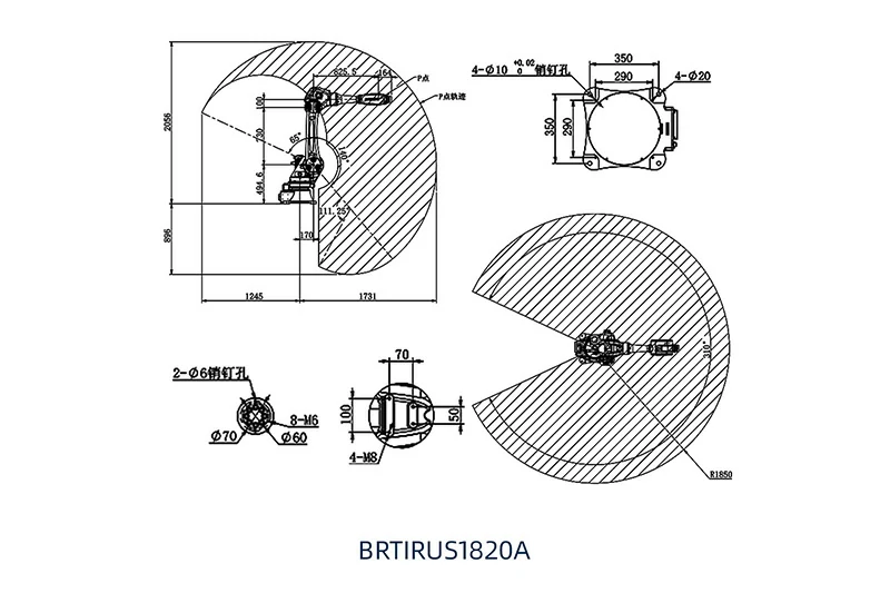 BRTIRUS1820A是博朗特针对复杂应用领域研发的一款多自由度六轴机器人。最大负载20kg,最大臂长1850mm。轻量化的手臂设计,紧凑简洁的机械结构,在高速运动状态下,可在狭小的工作空间内进行灵活作业,满足柔性化生产的需求。它具备六个自由度,适用于上下料、注塑机、压铸、装配、涂装行业、抛光、检测等。适用于500T-1300T的注塑机。手腕防护等级达到IP54,机身防护等级达到IP40。重复定位精度达到±0.05mm。
