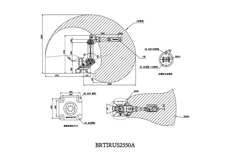BRTIRUS2550A型机器人是博朗特针对一些单调、频繁、重复性的长期作业或危险、恶劣环境下作业而研发的一款六轴机器人。最大臂长2550mm,最大负载50kg,具有六自由度柔性。适用于上下料、装配、成型、码垛等作业。防护等级腕部达到IP54,机身达到IP40,重复定位精度±0.1mm。