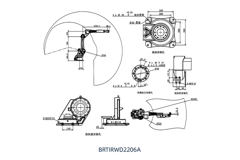 BRTIRWD2206A型机器人是博朗特针对焊接应用行业研发的一款六轴机器人。该机器人外形紧凑,体积小,重量轻,最大负载6kg,臂展2200mm。腕部采用中空结构,走线更便捷,动作更灵活。腕部防护等级达到IP54,机身防护等级达到IP40,重复定位精度达到±0.08mm。