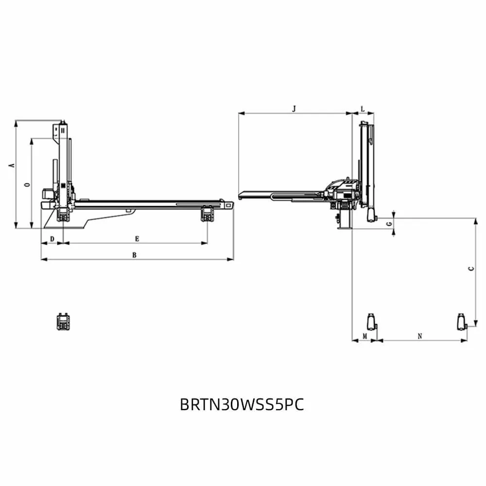 BRTN30WSS5PC/FC适用于2200T-4000T各型号注塑机,五轴交流伺服驱动,腕部带交流伺服轴,A轴旋转角度360°,C轴旋转角度180°。可自由调整夹具,使用寿命长,精度高,故障率低,维护简单。主要用于快速注射或复杂角度注射。尤其适用于汽车产品、洗衣机、家电等长形产品。五轴驱动器与控制器集成系统:信号线少,通讯距离远,扩展性能好,抗干扰能力强,重复定位精度高,可同时控制多轴,设备维护简单,故障率低。