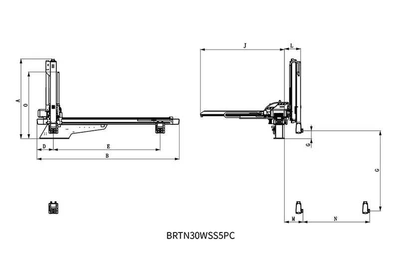 BRTN30WSS5PC/FC适用于2200T-4000T各型号注塑机,五轴交流伺服驱动,腕部带交流伺服轴,A轴旋转角度360°,C轴旋转角度180°。可自由调整夹具,使用寿命长,精度高,故障率低,维护简单。主要用于快速注射或复杂角度注射。尤其适用于汽车产品、洗衣机、家电等长形产品。五轴驱动器与控制器集成系统:信号线少,通讯距离远,扩展性能好,抗干扰能力强,重复定位精度高,可同时控制多轴,设备维护简单,故障率低。