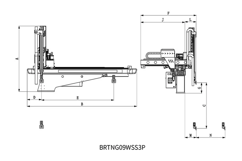 BRTNG09WSS3P/F系列适用于160T-380T各型号卧式注塑机,用于产品取出。垂直手臂为伸缩式,带产品手臂。三轴交流伺服驱动,比同类机型省时,定位精准,成型周期短。加装机械手后,生产效率提升10-30%,降低产品不良率,保障操作人员安全,减少人力投入,精准控制产量,减少浪费。三轴驱动器与控制器集成系统:信号线少,通讯距离远,扩展性好,抗干扰能力强,重复定位精度高,可同时控制多轴,设备维护简单,故障率低。