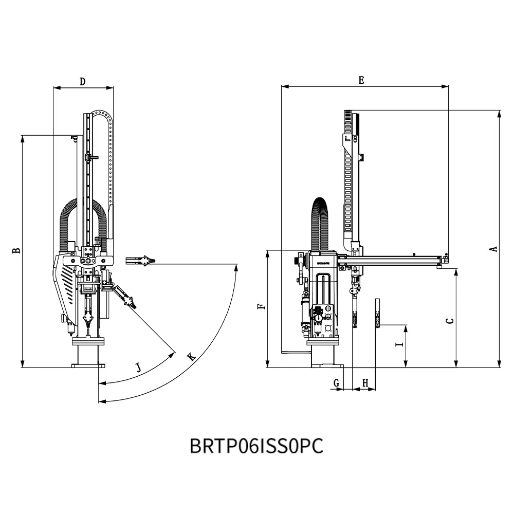 BRTP06ISS0PC为伸缩式,配备产品臂和流道臂,用于两板或三板模具产品的取出。横移轴由交流伺服电机驱动。