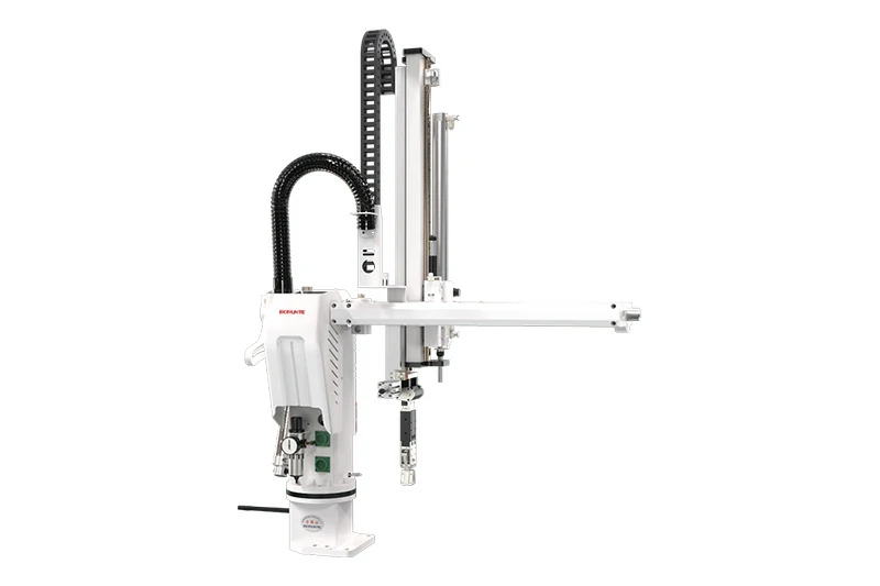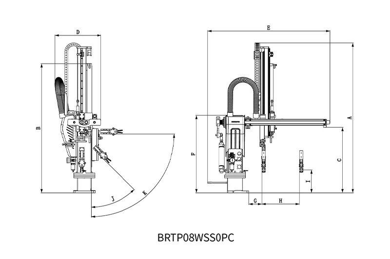 BRTP08WSS0PC系列适用于150T-250T各型卧式注塑机,用于产品取出。上下臂为单/双节式,上下动作、拉出、旋入均采用气压驱动,速度快、效率高。安装此机械手后,产能可提升10-30%,降低产品不良率,保障操作人员安全,减少人力投入,精准控制产量,减少浪费。