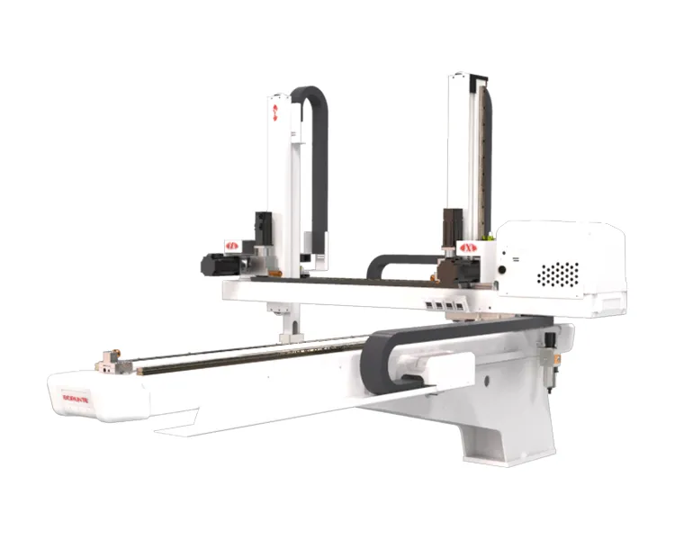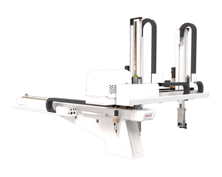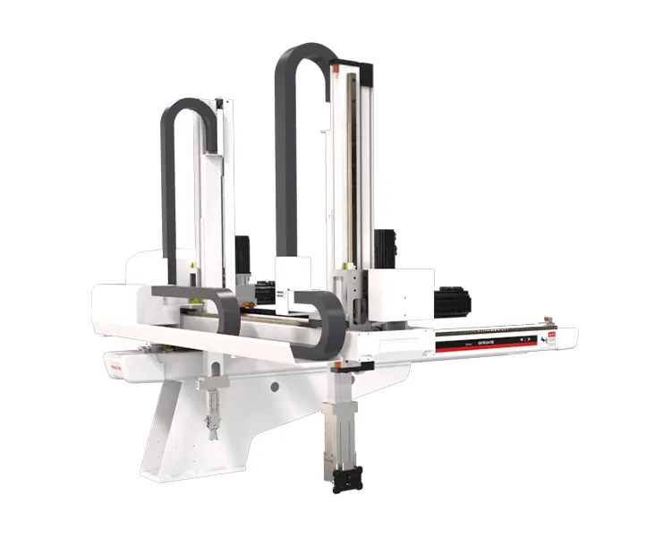 BRTR11WDS5PC/FC系列适用于320T-470T卧式注塑机取出成品及水口,手臂形式伸缩式,双臂,五轴交流伺服驱动,可用于快速取件或模内粘模、模内镶件等特殊产品应用,定位精准,速度快,寿命长,故障低,安装机械手可提高产能(10-30%),降低产品不良率,保障操作人员安全,减少人工。精准控制生产,减少浪费,保障交期。五轴驱控一体化控制系统:信号线少,远距离通讯,扩展性能好,抗干扰能力强,重复定位精度高,可同时控制多轴,设备维护简单,故障率低。