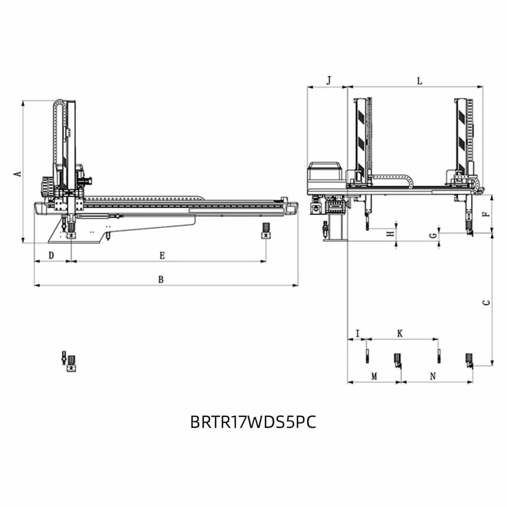 BRTR17WDS5PC/FC适用于750T-1200T各型号卧式注塑机,用于取出制品及流道。垂直臂为伸缩式阶段流道臂。五轴交流伺服驱动,也适用于模内贴标和模内嵌件应用。安装机械手后,生产效率可提高10-30%,降低制品不良率,保障操作人员安全,减少人力投入,精准控制产量,减少浪费。五轴驱动器与控制器集成系统:信号线少,通讯距离远,扩展性好,抗干扰能力强,重复定位精度高,可同时控制多轴,设备维护简单,故障率低。