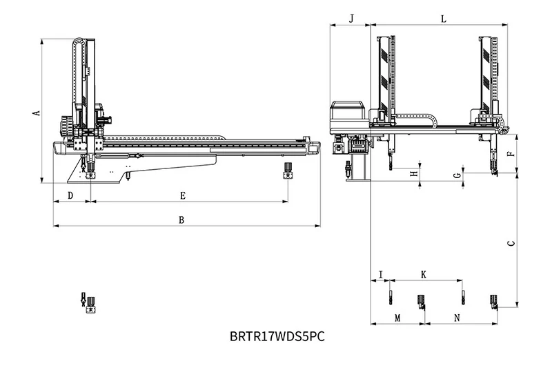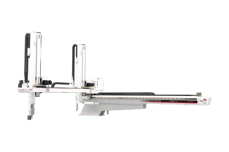 BRTR17WDS5PC/FC适用于750T-1200T各型号卧式注塑机,用于取出制品及流道。垂直臂为伸缩式阶段流道臂。五轴交流伺服驱动,也适用于模内贴标和模内嵌件应用。安装机械手后,生产效率可提高10-30%,降低制品不良率,保障操作人员安全,减少人力投入,精准控制产量,减少浪费。五轴驱动器与控制器集成系统:信号线少,通讯距离远,扩展性好,抗干扰能力强,重复定位精度高,可同时控制多轴,设备维护简单,故障率低。