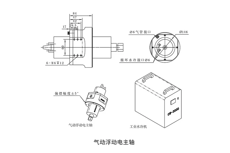 产品组成:1.浮动主轴体 2.高频变频器 3.工业水冷机