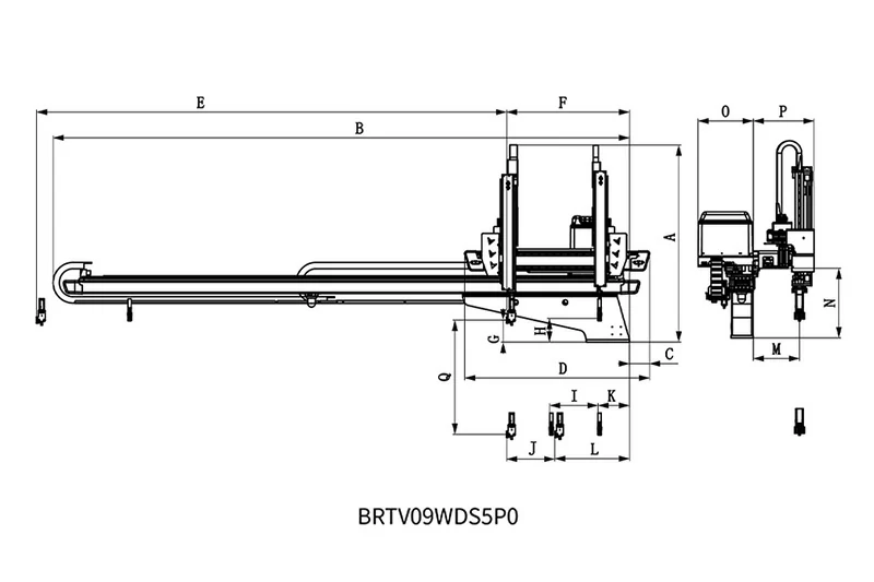 BRTVO9WDS5P0/F0系列适用于120T-320T各型卧式注塑机,用于取出产品及浇口。其安装方式与传统横梁式机械手不同,产品放置在注塑机末端。该系列机械手为双臂结构,垂直臂为伸缩式平台,垂直行程900mm。采用五轴交流伺服驱动。安装后,可节省顶出器安装空间30-40%,更充分利用厂房空间,提高生产效率,生产效率提升20-30%,降低不良率,保障操作人员安全,减少人力投入,精准控制产量,减少浪费。五轴驱动器与控制器集成系统:信号线少,通讯距离远,扩展性好,抗干扰能力强,重复定位精度高,可同时控制多轴,设备维护简单,故障率低。